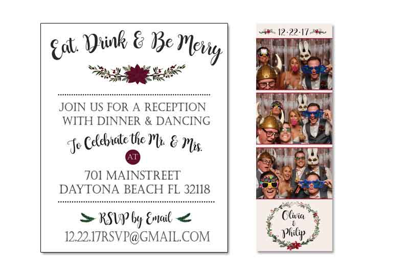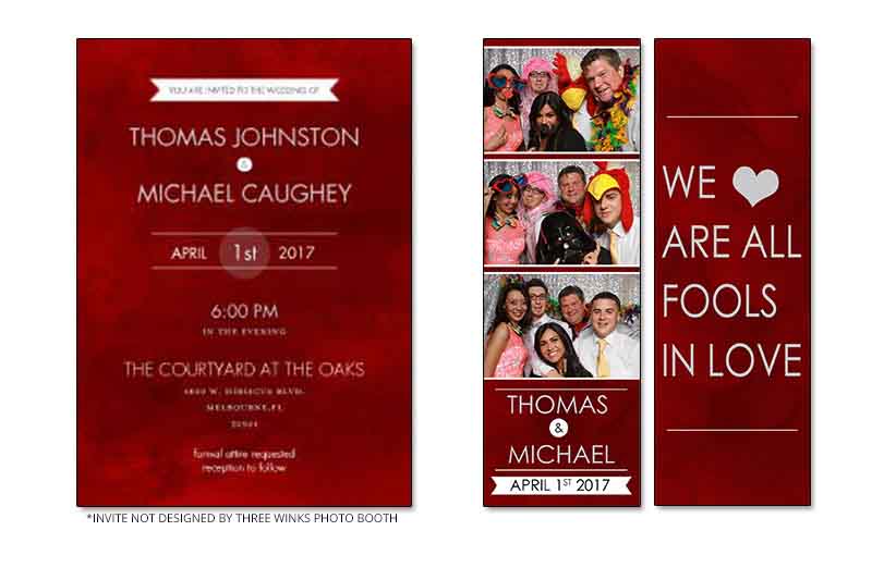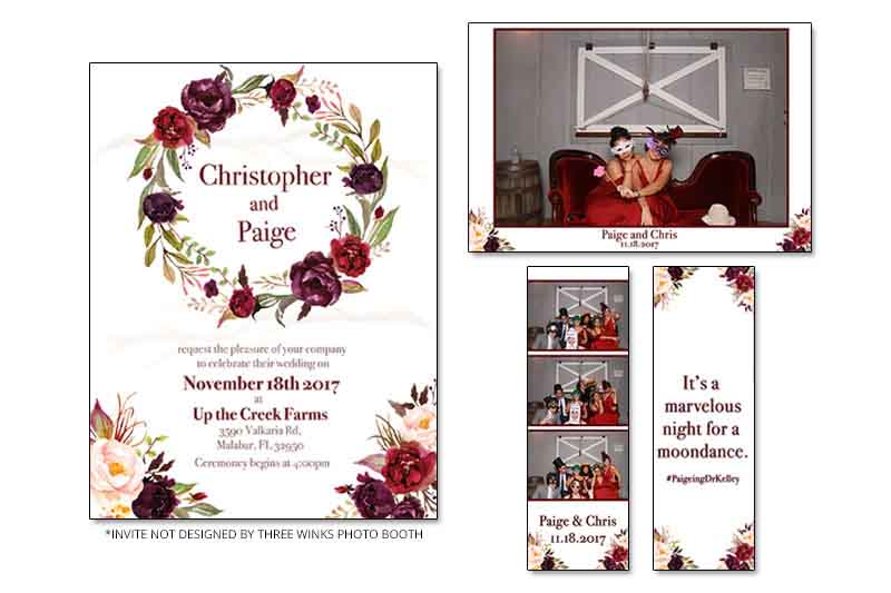 We here at Three Winks Photo Booth have a secret weapon….we have a graphic designer on our team. We will work with you to design the perfect graphic, logo or monogram to fill that empty space at the bottom of the photo strip. Each design is completely custom and we can incorporate names, dates, themes, colors, fonts, whatever your vision is. Some clients already have a graphic or a portion of an invitation they would like to use. We’ll come up with a few different options, you select your favorite and we’ll make any changes you desire.
